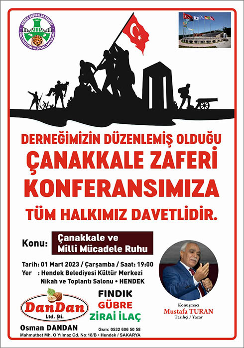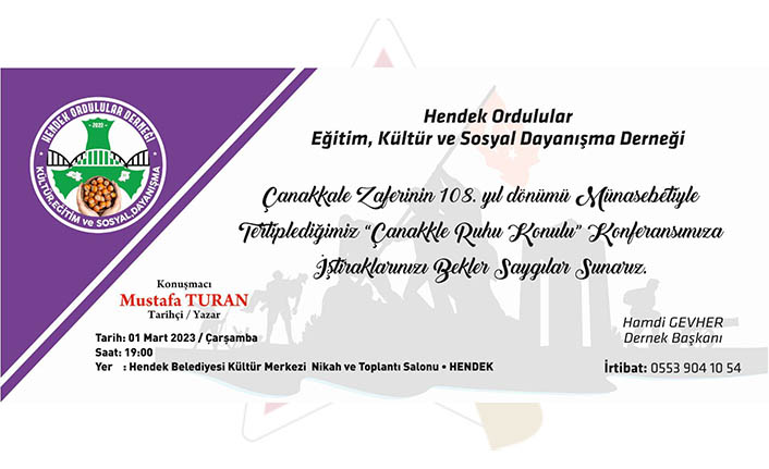 Hendek Ordulular Eğitim, Kültür ve sosyal yardımlaşma derneği tarafından’’ Çanakkale Ruhu’’ konulu konferans 1 Mart 2023 Çarşamba günü Saat 19.00 Hendek Belediyesi kültür merkezi nikah ve toplantı salonunda yapılacak.
