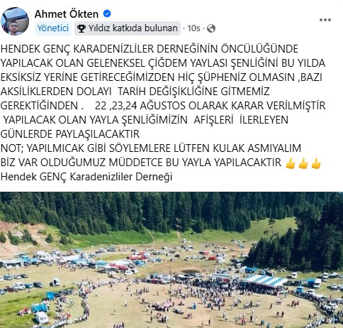 Sosyal medya’dan yapılan Açıklamada, Hendek Genç Karadenizliler Derneğinin Öncülüğünde Yapılacak Olan Geleneksel Çiğdem Yaylası Şenliğini Bu Yılda Eksiksiz Yerine Getireceğimizden Hiç Şüpheniz Olmasın ,Bazı Aksiliklerden Dolayı Tarih Değişikliğine Gitmemiz Gerektiğinden . 22 ,23,24 Ağustos Olarak Karar Verilmiştir