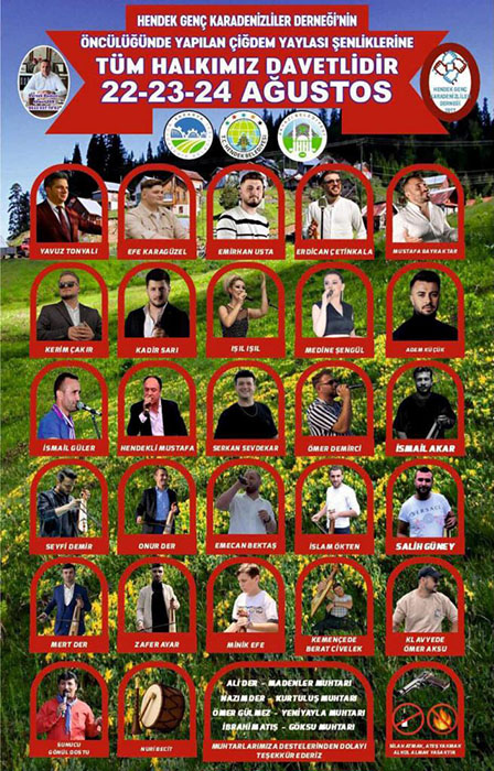 Hendek Genç Karadenizliler derneğinin düzenlediği, Sakaya Büyükşehir Belediyesi, Hendek Belediyesi ,Akyazı Belediyesi ve sponsorları katkıları ile düzenlene Geleneksel Çiğdem yayla şenlikleri 22-23-24 Ağustos tarihlerinde yapılacak.