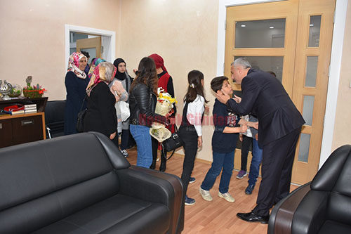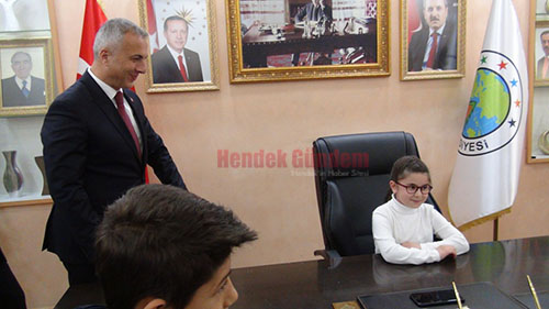 Hendek Belediye Başkanı Turgut Babaoğlu ziyarete Gelen çocuklardan Zeynep Kılıç’ı koltuğuna oturttu 23 Nisan ulusal egemenlik çocuk bayramını kutladı ve emrinizi bekliyorum dedi.