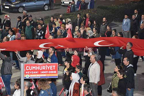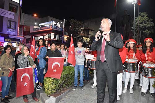 Yürüyüşün ardından Cumhuriyet Meydanında toplanan Vatandaşlara Arif Nihat Asya’nın Bayrak şiiri ile seslenen Hendek Belediye Başkanı Turgut Babaoğlu konuşmasında, bu Vatanı bizlere emanet eden rahmeti rahmana kavuşan değerli büyüklerimizi rahmet ve şükran ile anıyoruz. Bu akşam Cumhuriyetimizin 96. Yıl dönümü vesilesiyle düzenlemiş olduğumuz programımıza iştiraklerinizden ötürü Türk ordusunun şerefli mensupları, emniyet teşkilatımızın şerefli mensupları ve şerefli Hendek halkı çoluk çocuk hepinize bizleri yanlız bırakmadığınız için ayrı ayrı teşekkür ediyorum.