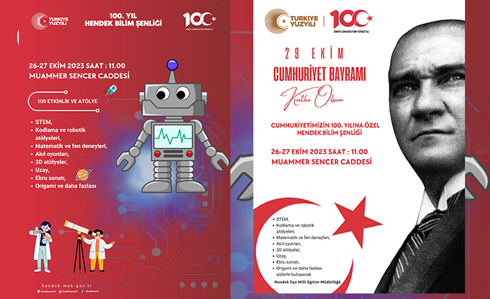 Hendek İlçe Milli Eğitim Müdürlüğü tarafından düzenlenen "Cumhuriyetimizin 100. Yılına Özel Hendek Bilim Şenliği" 26-27 Ekim 2023 tarihlerinde Muammer Sencer Caddesi'nde saat 11.00'de gerçekleşecek. Şenlik, "100 Etkinlik ve Atölye" başlığı altında birçok farklı alanda etkinlikleri içeriyor. İşte bazı başlıklar: