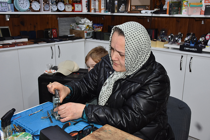 Eşine yardım eden Asuman Özger, "Müşterilere saat satıyorum, cam takabiliyorum, duvar saatlerine makineler takabiliyorum.