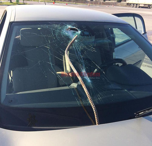 Otomobilin camını delerek ok gibi saplanan yaklaşık 1 metre uzunluğunda ki Demir Çubuk sürücü Cemil K.’yi yaraladı.