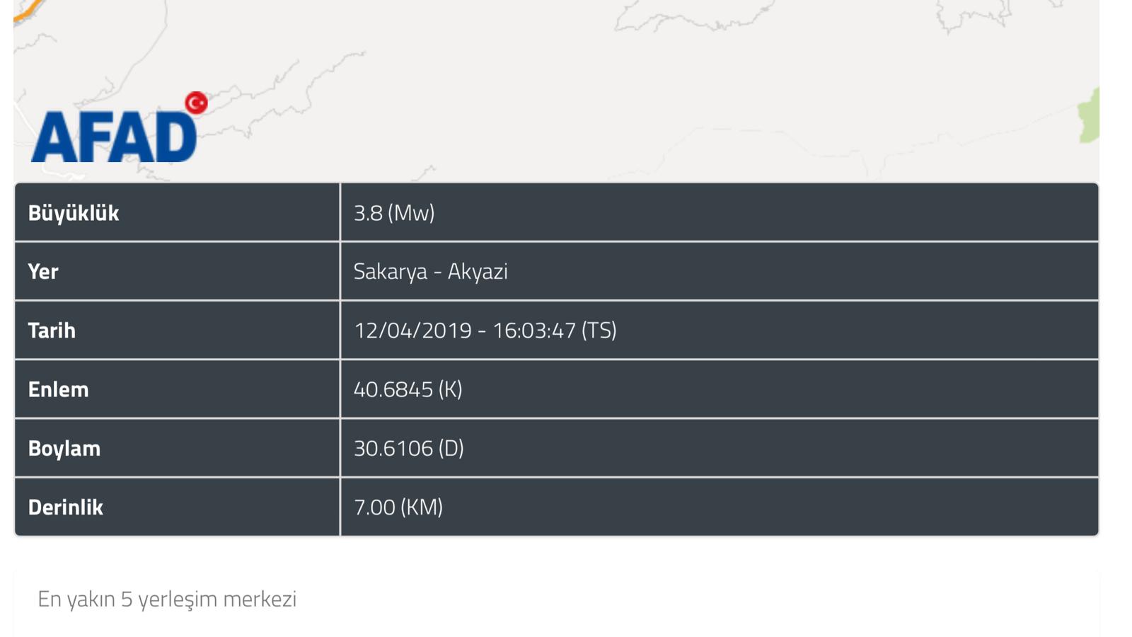 Afet ve Acil Durum Merkezi Müdürlüğünden (AFAD) edinilen bilgilere göre Saat: 14.03’te meydana gelen Depremin merkez üssü Akyazı olarak açıklanırken yerin 7 km derinliğinde meydana gelen depremin şiddetinin ise 3,8 olduğu belirtildi.