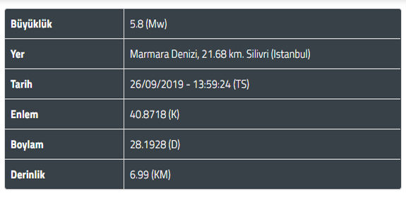 Afet ve Acil Durum Merkezi Müdürlüğünden (AFAD) edinilen bilgilere göre Saat: 13.59’da meydana gelen Depremin merkez üssü Marmara Denizi Silivri açıkları olarak açıklanırken yerin 6,99 km derinliğinde meydana gelen depremin şiddetinin ise 5,8 olduğu belirtildi.