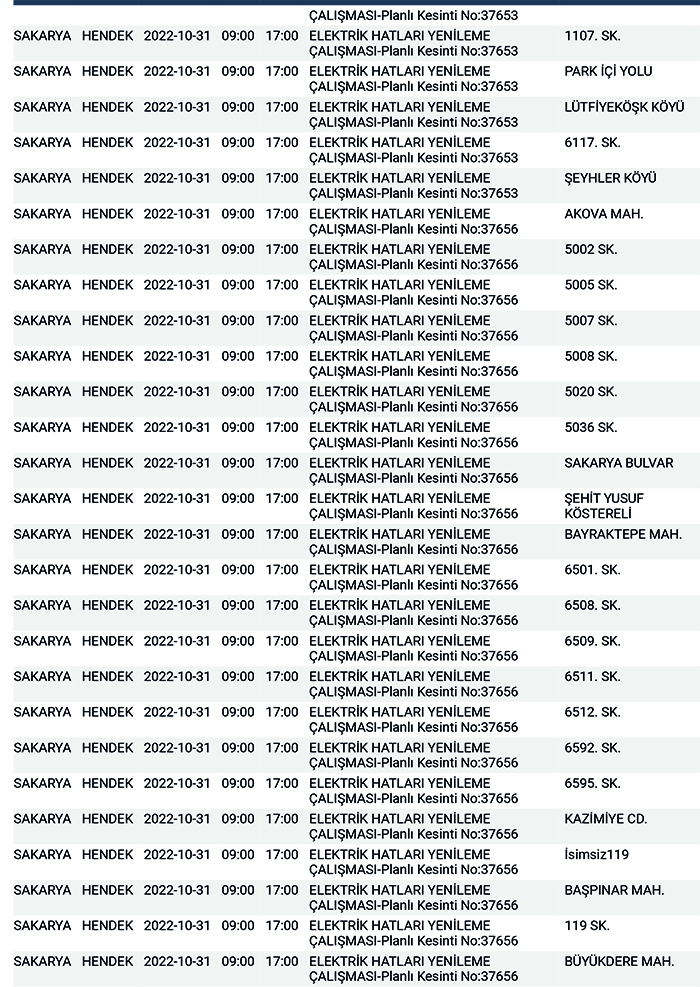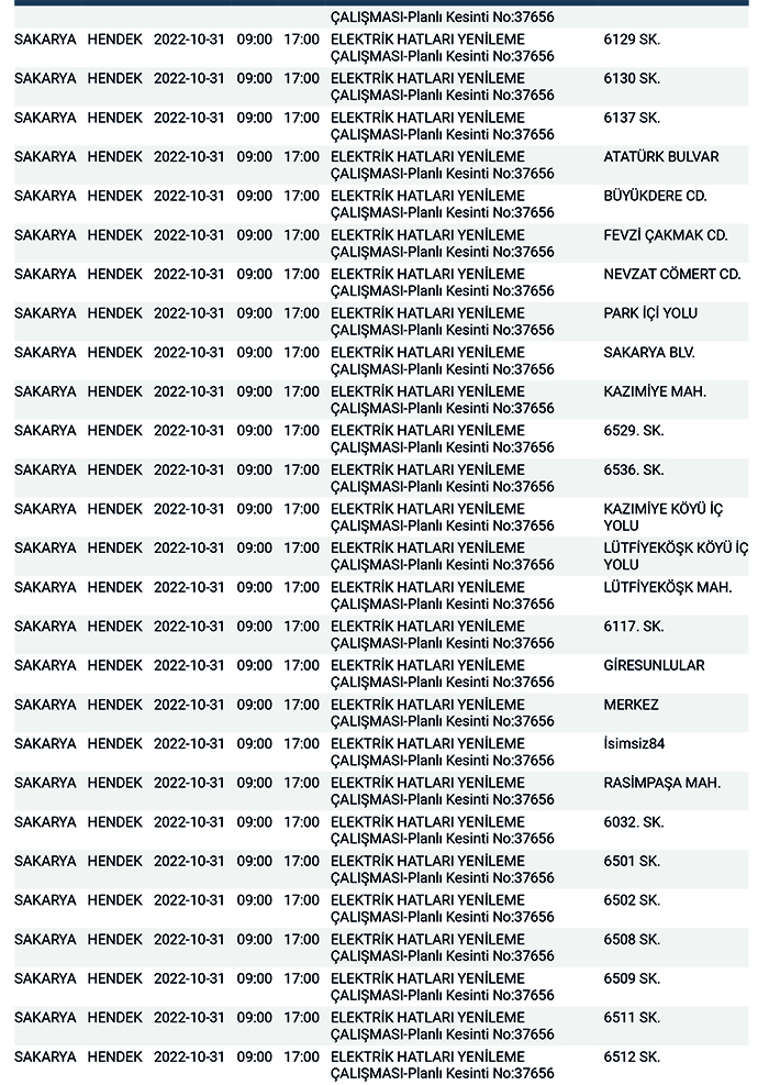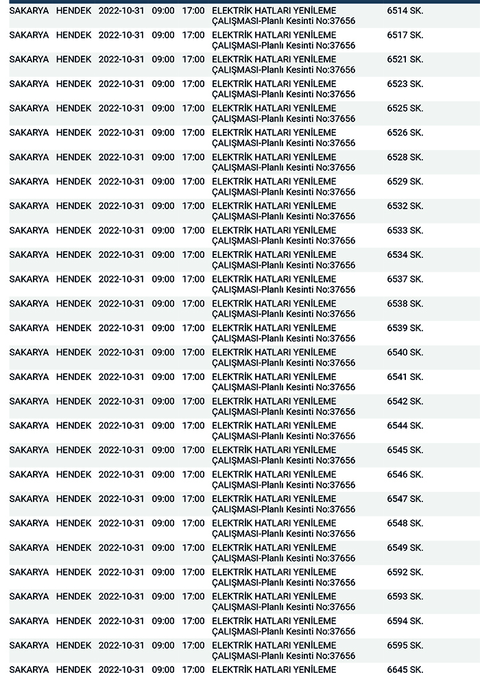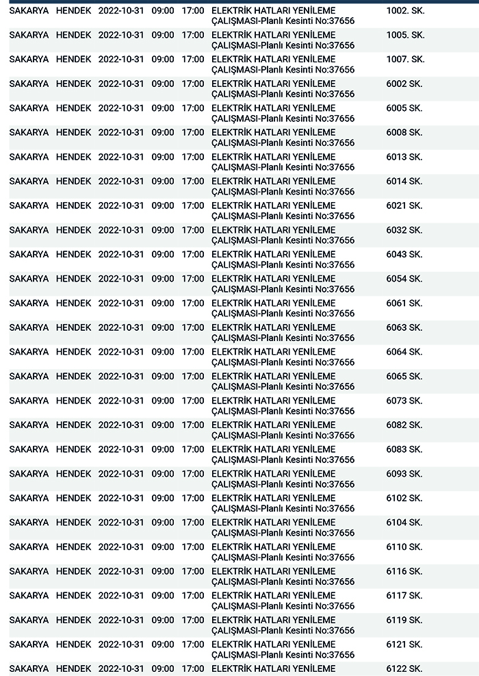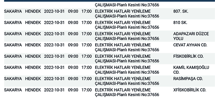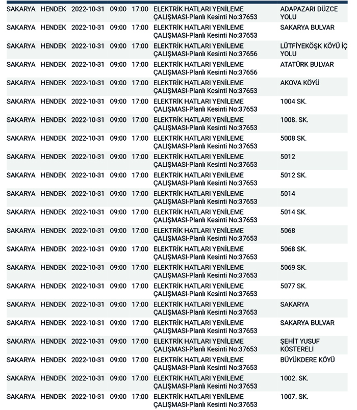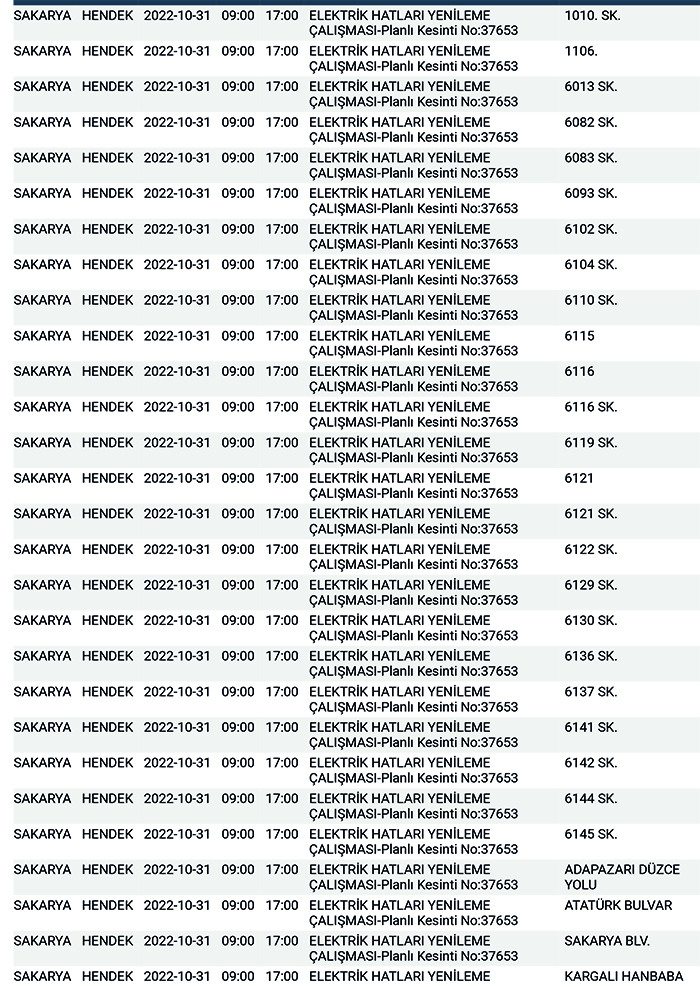 SEDAŞ’tan yapılan planlı elektrik kesintisi duyurularına göre, Hendek’te bugün 168 ayrı noktada Sabah 09:00’dan başlamak üzere 17.00’a kadar “Elektrik Hatları Yenileme Çalışması” kapsamında planlı elektrik kesintisi uygulanacağı öğrenildi.
