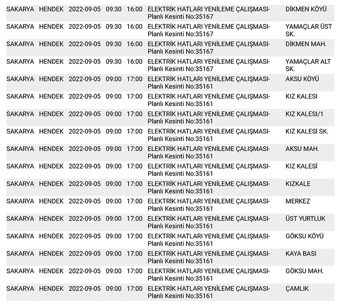 SEDAŞ’tan yapılan planlı elektrik kesintisi duyurularına göre, Hendek’te bugün 17 ayrı noktada Sabah 09:00’dan başlamak üzere 17.00’a kadar “elektrik Hatları Yenileme Çalışması” kapsamında planlı elektrik kesintisi uygulanacağı öğrenildi.