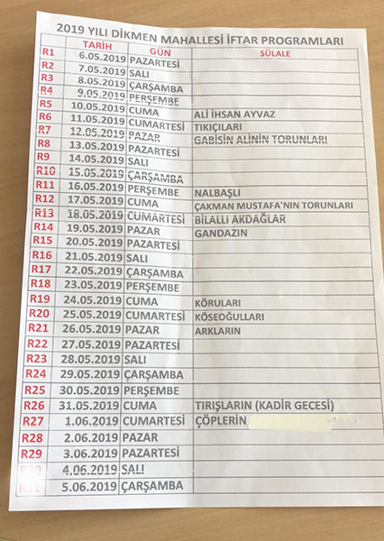 Ramazan ayı boyunca Dikmenli Sülale ve Aileler tarafından düzenlenen İftar davetlerine 1000 ile 1500 kişi arasında misafir katılarak aynı iftar sofrasında bir araya geliyorlar.