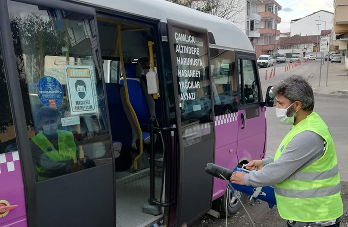 İlçe genelinde kamu binaları başta olmak üzere parklar, duraklar, berberler, kuaförler ve halkın yoğun olarak kullandığı noktalarda dezenfekte çalışmaları sürüyor. Bu kapsamda ilçemizdeki toplu taşıma araçlarında da düzenli olarak dezenfekte çalışması yapılıyor.