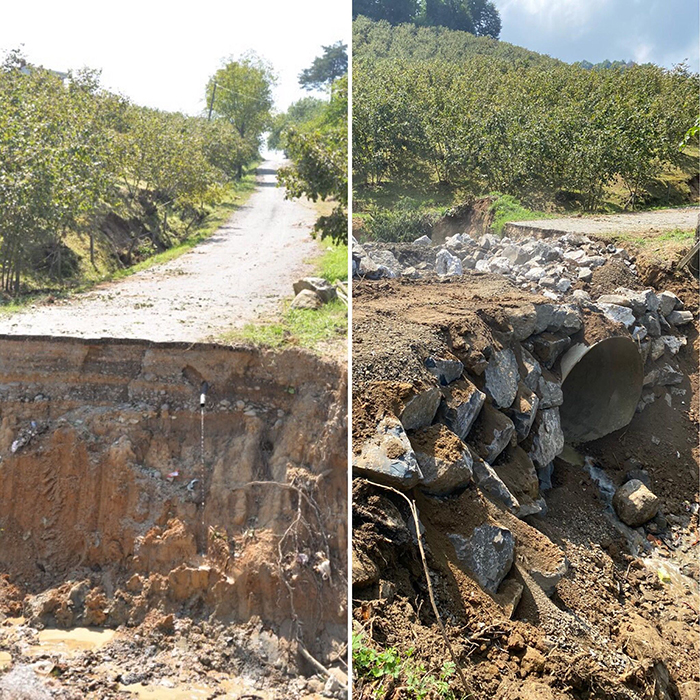 Ekipler Sümbüllü Mahallesinde aşırı yağışlar sonucu yıkılan köprünün yerine yeni yol bağlantısı oluştururken, Kırktepe Mahallesinde ise yoğun yağış sonrasında yolda oluşan toprak kaymasının yanı sıra dere temizliği ve yol bakım çalışmalarına devam ediyor.