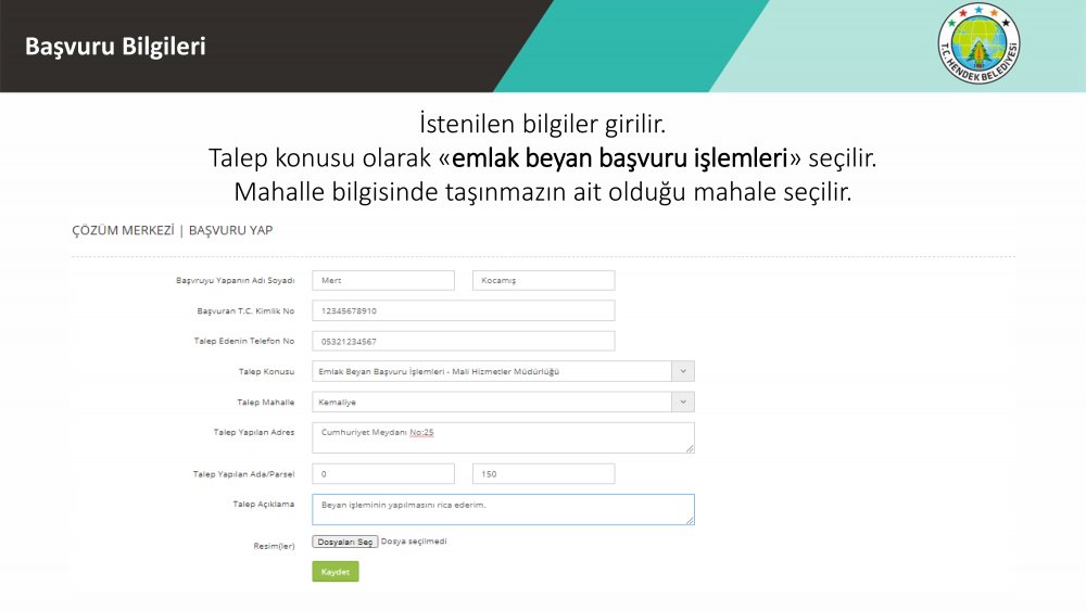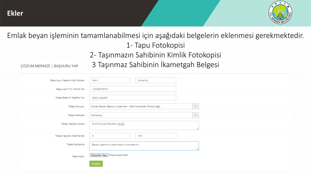 Hendek Belediyesinden yapılan açıklamada, “Vatandaşlar belediye binasına gelmeden ev ve iş yerlerinden “www.intranet.hendek.bel.tr/cozummerkezi” adresine girerek beyanname işlemlerini yapabilecek. Bu yeni uygulama sayesinde vatandaşlar cezalı duruma düşmeden hem zamandan kazanacak hem sıra beklemeden işlemlerini yapacak. Aktif bir şeklide işleyen sistemde vatandaşlar işlemlerini yapabilecek” denildi.