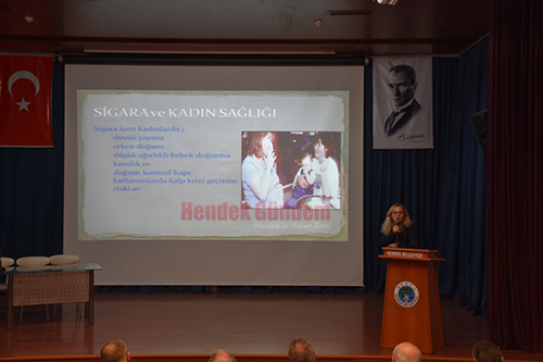 Programda İlçe Sağlık Müdürlüğü Personeli Uzman Hemşire Deniz De Asis’de dünya da 1.5 milyar kişinin sigara kullandığın ve bu kişilerin yarısının sigara yüzünden öleceğinin tahmin edildiğini belirterek “Tütün kullanımı böyle devam ederse 100 yıl içerisinde 12 milyar kişi bu yüzden hayatını kaybedecek. Türkiye’de 2008 ile 2012 yılları karşılaştırıldığında sigara kullanımı yüzde 31.2’den yüzde 27.1’e gerilemiştir. 15 yaşından önce sigaraya başlayanların oranı ise yüzde 19.6’dan yüzde 16.1’e düşmüştür. Bu düşüşler sevindirici ama yeterli değil. Bu konu da hepimiz son derece hassas ve iradeli, olmalıyız ”dedi.