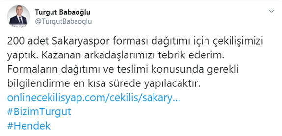 Hendek Belediye Başkanı Turgut Babaoğlu, kendisine ait sosyal medya hesabından yaptığı açıklamada “200 adet Sakaryaspor forması dağıtımı için çekilişimizi yaptık. Kazanan arkadaşlarımızı tebrik ederim. Formaların dağıtımı ve teslimi konusunda gerekli bilgilendirme en kısa sürede yapılacaktır” ifadelerine yer verdi.