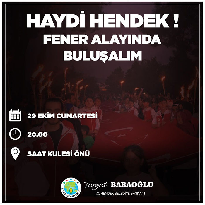 Başkan Turgut Babaoğlu Cumhuriyetimizin 99.yılı münasebetiyle, ‘Fener Alayı’ düzenleyeceklerini duyurarak, “ 29 Ekim Cumhuriyet Bayramı akşamı saat 20.00’da Muammer Sencer Caddesinde bulunan Saat Kulesi önünde buluşuyoruz. Saat tam 20.00’da Şanlı Türk Bayrağımızla, marşlar eşliğinde Cumhuriyet Meydanına kadar yürüyeceğiz. Cumhuriyetimizi coşkuyla doya kutlayacağımız bu güzel organizasyona tüm hemşerilerimizi bekliyorum” dedi.