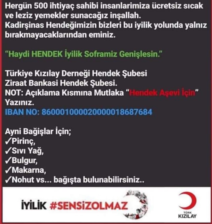 Not: Açıklama kısmına mutlaka (Hendek Aşevi İçin) yazılması gerekmektedir.