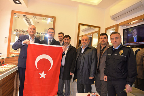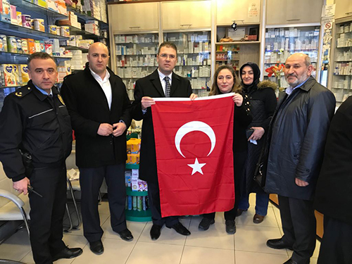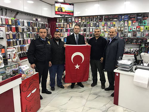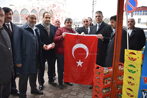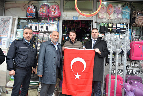 Kaymakam Orhan Burhan, Belediye Başkanı İrfan Püsküllü, İlçe Emniyet Müdürü Şevket İlhan, AK Parti İlçe Başkanı Ali Kemal Sofu, Hendek’teki esnafları ziyaret ederek bayrak hediye ettiler.
