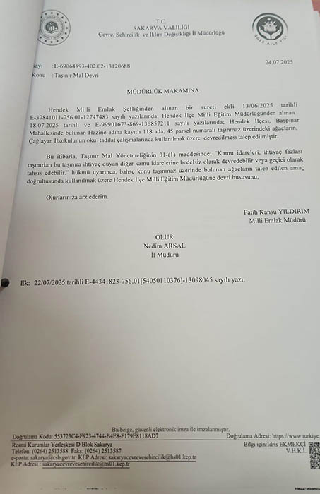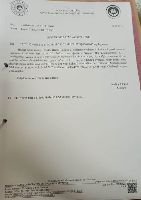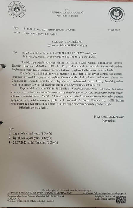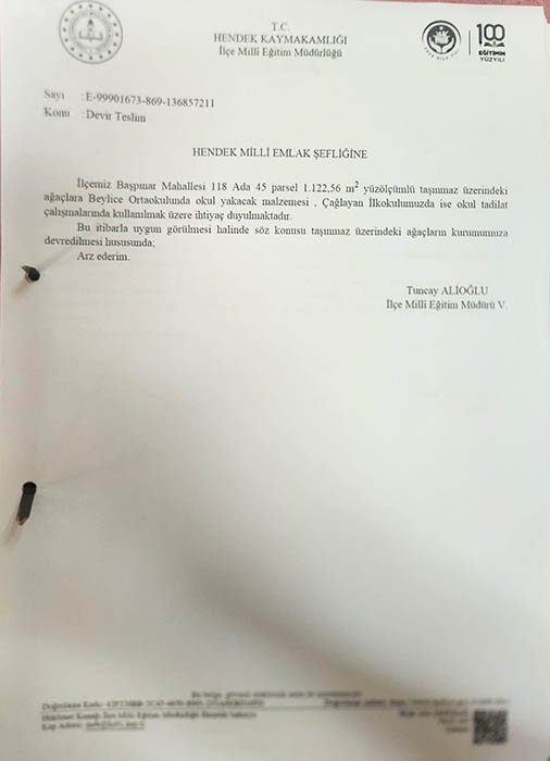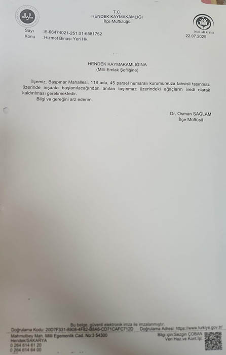 Hendek İlçemiz Başpınar, Mahallesi Cem Çerkezoğlu Caddesi, 118/45 Ada-Parsel numaralı, mülkiyeti Maliye Hazinesine ait, Diyanet İşleri Başkanlığına tahsisli, kamuya ait parselde resmi yazışmalar neticesinde yapılan ağaçların güvenli kesim işlemi ile ilgili olarak; bu parselde yapılacak olan yeni Müftülük Binası inşası nedeniyle belediyemizden kesim talebinde bulunulmuş, belediyemizce de Hendek Orman İşletme Müdürlüğünün koordinesinde ağaçların kesim işlemleri yapılmıştır.