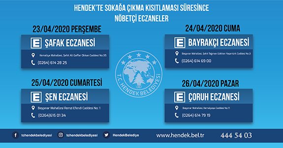 Kültür ve Sosyal İşler, Sağlık İşleri, Zabıta, Temizlik İşleri ve Çağrı Merkezi başta olmak üzere ilgili tüm birimler yasak süresi boyunca görevde olacaklar. Ulaşım, ihtiyaçların temini, hasta nakil gibi tüm hizmetler aksamadan devam edecek.  Vatandaşların Hendek Kaymakamlığı Vefa Sosyal Destek Grubu ve Hendek Belediyesi çağrı merkezi ile irtibata geçmesi istenirken; fırın, akaryakıt istasyonu ve oto lastik tamircilerinin iletişim bilgileri de görsellerle duyuruldu.