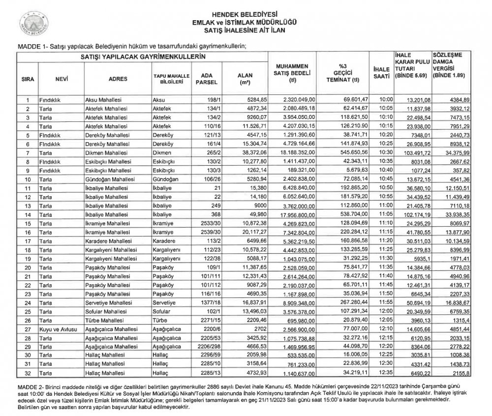 Bu kapsamda 2886 sayılı Devlet İhale kanunun 45.maddesi hükümleri çerçevesinde Paşaköy, Sofular, A.Çalıca, Aksu, Aktefek, Dereköy, Dikmen, Eskibıçkı, Gündoğan, İkbaliye, İkramiye, Karadere Kargalıyeni, Türbe ve Hallaç mahallelerinde 32 ayrı tarla, fındıklık, kuyu ve avlusu için 22 Kasım 2023 Çarşambagünü Hendek Belediyesi Kültür ve Sosyal İşler Müdürlüğü Nikâh/Toplantı salonunda ihale gerçekleştirilecek.