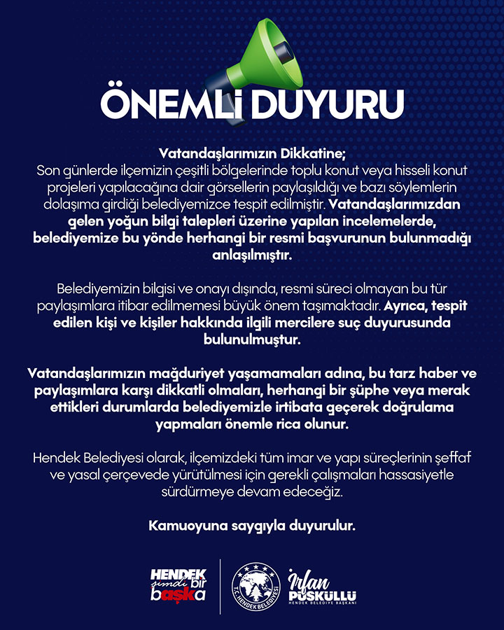 Son günlerde ilçemizin çeşitli bölgelerinde toplu konut veya hisseli konut projeleri yapılacağına dair görsellerin paylaşıldığı ve bazı söylemlerin dolaşıma girdiği belediyemizce tespit edilmiştir.