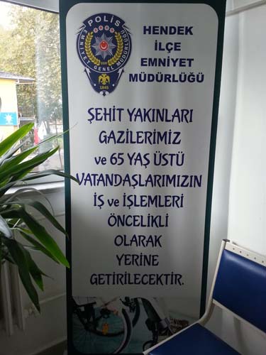 Hendek İlçe Emniyet Müdürlüğü hizmet binasındaki Trafik Tescil , Detleme ve Pasaport Büro Amirliğindeki hizmetlerin hızlandırılması için Şehit yakınlarına, gazilere ve 65 yaş üstü yaşlılara öncelik tanınacak. Emniyet ise bu uygulamayı afiş yaparak vatandaşa duyuruyor.