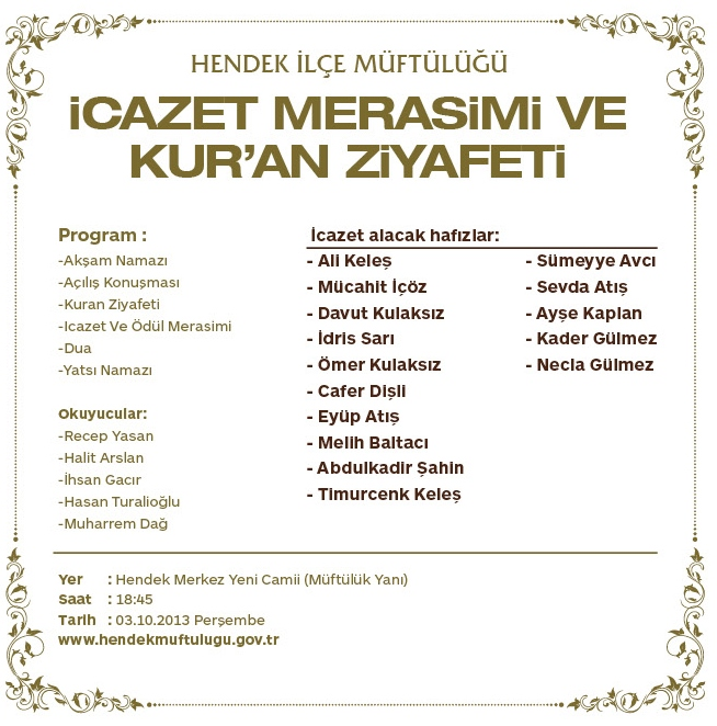 Camiler ve Din Görevlileri Haftası münasebeti ile Hendek müftülüğümüzün düzenleyeceği İcazet merasimi ve Kur’an ziyafeti programına tüm halkımız davetlidir.