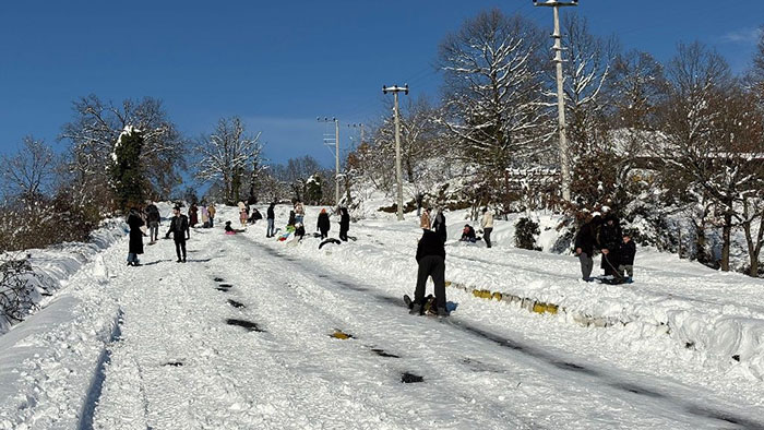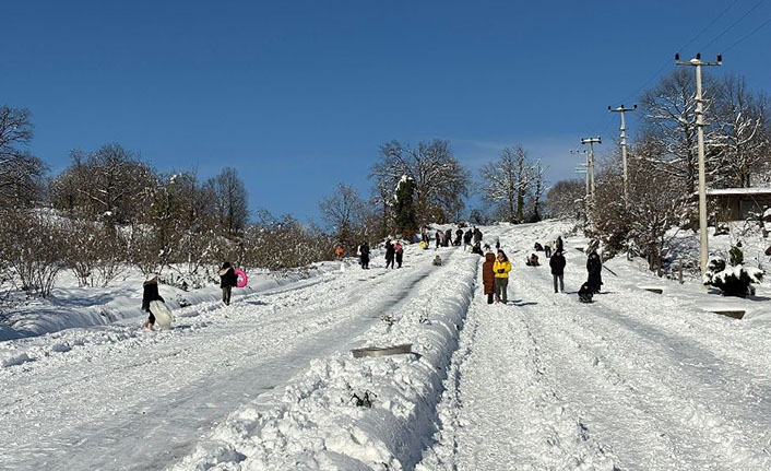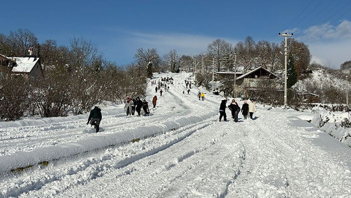 Kızakları ve şişme simitlerini alan genç yaşlı çoluk çoluk Vatandaşlar trafiğe kapalı olan yol üzerinde kayak merkezlerini andırmayan görüntüler oluştururken, kar keyfini en çok çocuklar yaşadı.