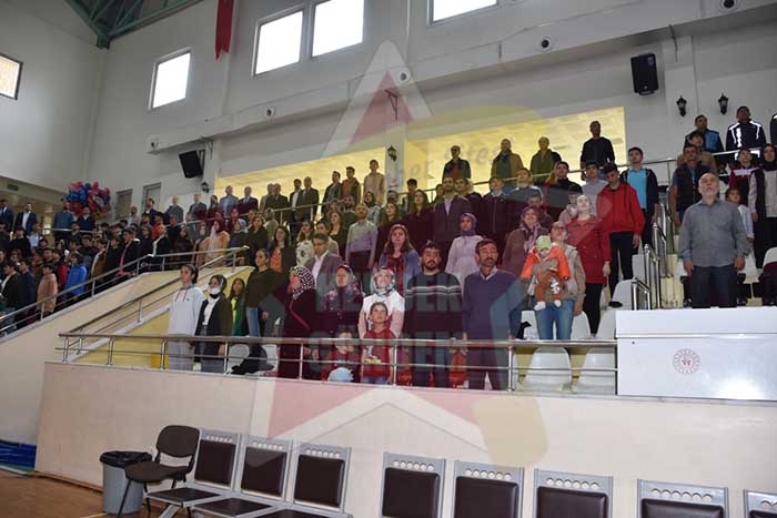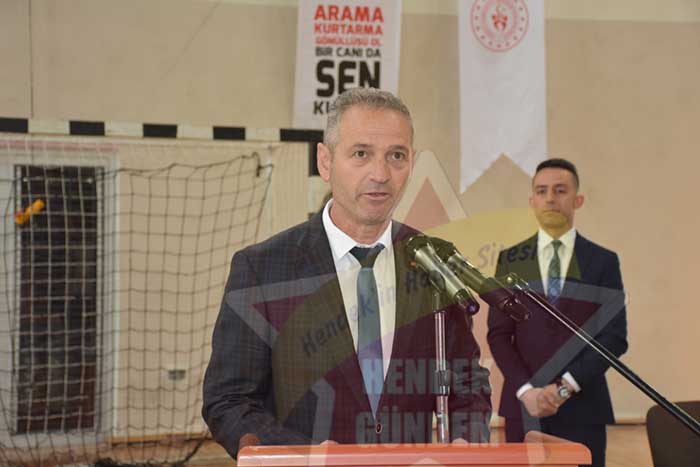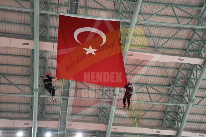 Hendek Kaymakamı Halil İbrahim Acır ve Hendek Belediye Başkanı Turgut Babaoğlu’nun Okullar, Protokol ve Vatandaşları selamlamaları sonrası saygı duruşu ve İstiklal Marşı okunması esnasında Sakarya Arama Kurtarma Ekibi (SAKE) Üyelerinin Kapalı Spor Salonu çatısından dev Türk Bayrağı açması ve inişi salonda bulunan Vatandaşlar tarafından büyük alkış aldı.