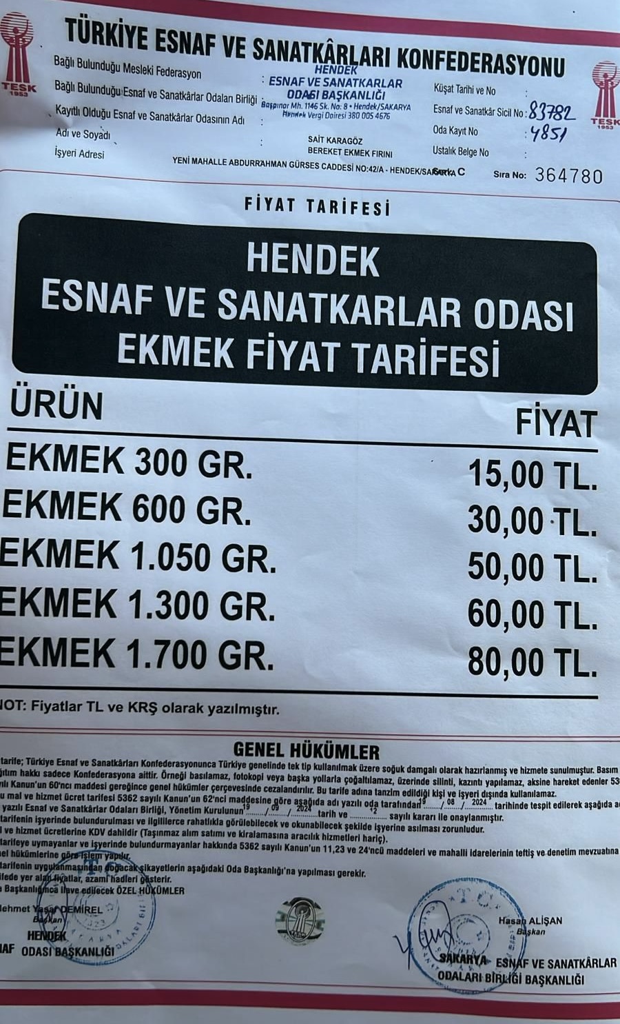 200gr olan ekmekler 100 gr artırılırken fiyatı ise 10 liradan 15 liraya çıkarıldı. SESOB Komisyonu'ndan çıkan zam talebinin Ticaret Bakanlığı'nca kabul edilmesi ile birlikte Sakarya’dan sonra İlçemiz Hendek’te de ekmek fiyatları zamlanmış oldu.