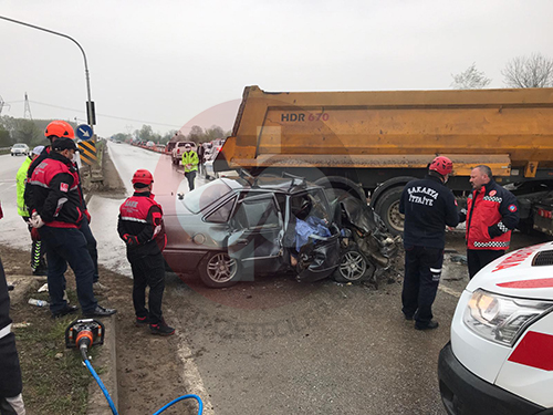 Edinilen bilgilere göre, Hendek D-100 Karayolu Kargalıhanbaba mevkii Adapazarı istikametinde meydana gelen olayda, H.A. idaresindeki 55 BCK... plakalı otomobil, D.S. yönetimindeki 49 AAE... plakalı hafriyat kamyonu ile çarpıştı.