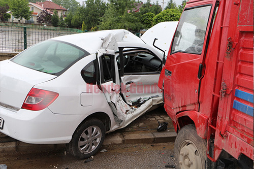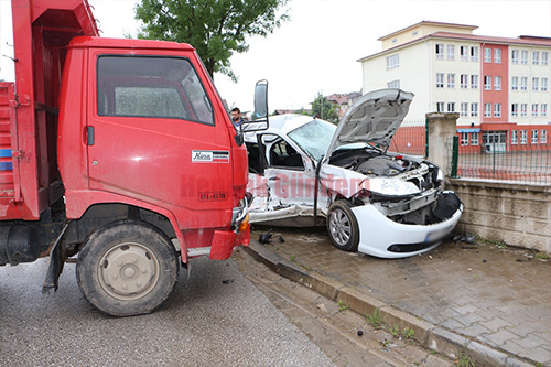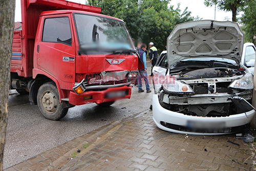 Edinilen bilgilere göre, Sarıdede Mahallesi ışıklı kavşağından Mahmutbey Mahallesi istikametinde ilerleyen Mahmut K. (34) idaresindeki 54 KC... plakalı kamyonet ile ara sokaktan aynı yol güzergâhına çıkmak isteyen Sinan E. (45) idaresindeki 34 VU… Plakalı özel otomobil çarpıştı. Çarpışmanın şiddeti ile savrulan özel otomobil Noksel İlköğretim Okulunun duvarına çarparak durabildi.