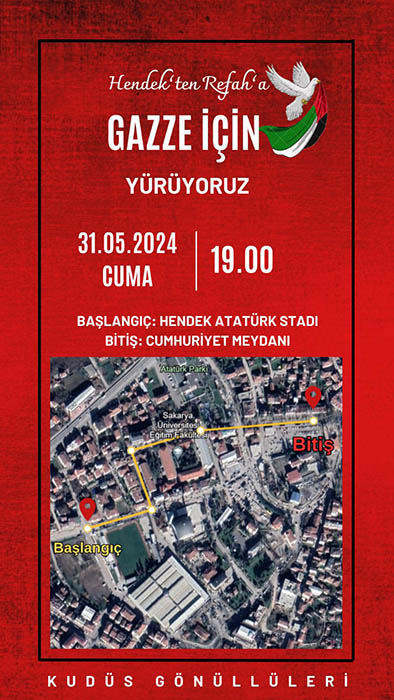 31 Mayıs cuma günü saat 19.00 düzenlenecek yürüyüş Hendek Atatürk Stadında başlayıp Hendek Cumhuriyet meydanında bitecek.