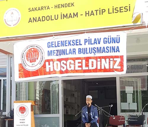 Dernek başkanı Fatih Tazim konuşmasında " İlçe Milli Eğitim Müdürüm şube müdürlerim siyasi partilerimizin değerli mensupları saygıdeğer basın mensupları çok kıymetli müdürlerimiz ve öğretmenlerimiz Hendek İmam Hatip Lisesinin güzide mezunları ve mensupları derneğimizin her yıl geleneksel olarak düzenlemiş olduğu mezunlar günümüze hoş geldiniz sefalar getirdiniz hepinizi en derin saygı ve muhabbetle selamlıyorum. Hepimiz asırlar boyunca birçok medeniyete ve güzelliklere ev sahibi yapmış değerli bir coğrafyada yaşamaktayız Anadolu’nun bağrından yetişen Mevlanaların Yunus Emrelerin Koca Sinanların ve daha nice büyük zatları her bir karış toprağını manen zenginlikleriyle yoğurdukları bu topraklar Seyit Onbaşılar Ömer Halisdemirler Fethi Sekinler ve binlerce şehidimizin mübarek kanlarıyla şereflenmiş Ve bizlere bırakmış oldukları iman vatan millet ve bayrak gibi mühim değerler ile birlikte özleşmiş ve bütünleşmiştir İman ve inanç kavramları ile özdeşleşen vatanımız tarihler boyunca İslam’a ve İslam’ın yayılmasına çok büyük katkıları olmuştur öncelikle Müslüman olmaktan tarihe adını şan ve şerefle yazdıran yüce vatanımızın bir ferdi olmaktan gurur duymalıyız bu vatanın evlatları olarak Allah ve resulünün kelamını yaymaya gönül vermiş ümmetin önderi ve dava adamı hak yolunda çalışan adı ve manası ile bütünleşmiş ve imam hatip bilincini yaşıyor olmaktan da ayrıca gurur duymalıyız İmam hatipli olarak kalabilmeli ve buna göre yaşamalıyız dedi.