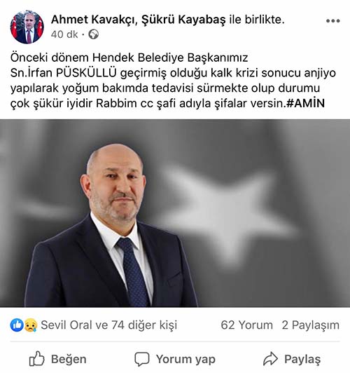 Kavakçı paylaşımında “önceki dönem Hendek Belediye Başkanımız Sn. İrfan Püsküllü geçirmiş olduğu kalp krizi sonucu anjiyo yapılarak yoğun bakımda tedavisi sürmekte olup durumu çok şükür iyidir Rabbim cc şafi adıyla şifalar versin” ifadelerine yer verdi.