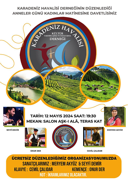 Karadeniz Havalisi Kültür, Yardımlaşma ve Dayanışma Derneği, 12 Mayıs Pazar günü (Yarın) Saat: 19.30’da Anneler Gününe özel Kadınlar Matinesi düzenliyor.