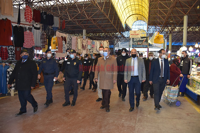 Kaymakam Halil İbrahim Acır, Belediye Başkan Yardımcısı Fatih Öztürk, İlçe Emniyet Müdürü Şevket İlhan, İlçe Jandarma Komutanı Teğmen Hasan Alataş, Polis, Jandarma, Zabıta, gıda sağlık kontrolörleri Pazaryerinde denetimler gerçekleştirdiler.
