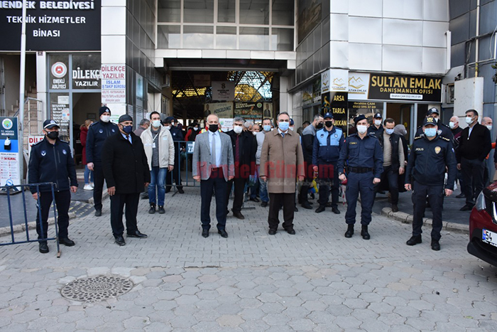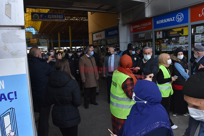 7 giriş kapısı olan kapalı pazaryeri girişleri 4’e düşürülürken, giriş noktalarında Emniyet, Jandarma ve Zabıta ekiplerince Vatandaşların ateşleri ölçülerek HES kodu denetimleri gerçekleştirildi, maske, mesafe ve hijyen konularında bilgilendirmeler yapıldı. Pazaryeri girişlerinde 28 personel görev yaptı.