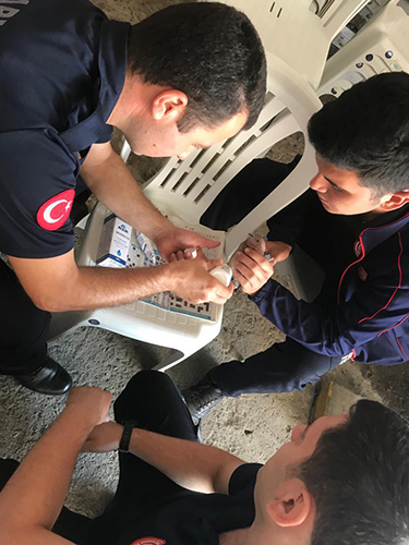 Korkan yavruya elleriyle su içiren itfaiyeciler daha sonra yaralı kumruyu veterinere teslim ettiler.