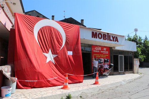 Hendek’te Mobilya işleri ile uğraşan Erdal Aydın ve Süleyman Gürsel, Diyarbakırda yaşanan Bayrak Krizi sonrası tepkilerini iş yerlerine astıkları büyük bir Türk Bayrağı ve yazdıkları not ile gösterdiler.