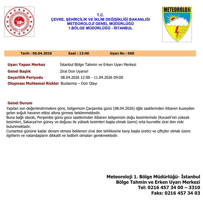 Buna bağlı olarak, Perşembe günü gece saatlerinden itibaren bölgemizin doğu kesimlerinde (Kocaeli’nin yüksek kesimleri, Sakarya’nın güney ve doğusu ile yüksek kesimleri başta olmak üzere) orta kuvvette zirai don ve buzlanma riski bulunmaktadır.