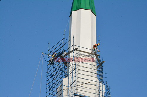 54 metre yükseklikte olan Rasimpaşa cami minaresinin yaklaşık 35 metre yükseklikte çalışan işçilerde ne baret nede güvenlik için emniyet halatı var. Hiçbir güvenlik önlemi almadan çalışan işçiler kurulan iskele üzerinde ki tahtalar üzerinde adeta cirit atıyorlar.