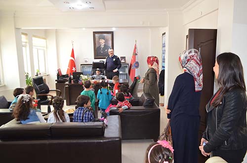 Hendek Akova İlkokulu ve Anasınıfı öğrencileri 10 Nisan Polis Haftası dolayısıyla İlçe Emniyet Müdürü İsmail Baş’ı makamında ziyaret ederek Polis Haftasını kutladılar. Emniyet Müdürü İsmail Baş kendisini ziyarete gelen minik öğrencilerden Buğra Yılmaz’ a makam koltuğunu göstererek “Buyurun Müdürüm” diyerek hoş geldin dedi.