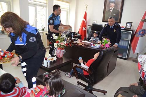 Emniyet Müdürü Baş, kendisini ziyarete gelen minik öğrencilere kek ve meyve suyu ikram etti.