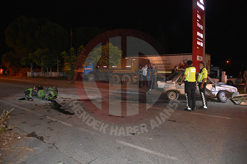 Edinilen bilgilere göre, Hendek Yenimahalle Abdurrahman Gürses Caddesi üzerinde bir petrol istasyonu önünde motosiklet ile otomobil çarpıştı.
