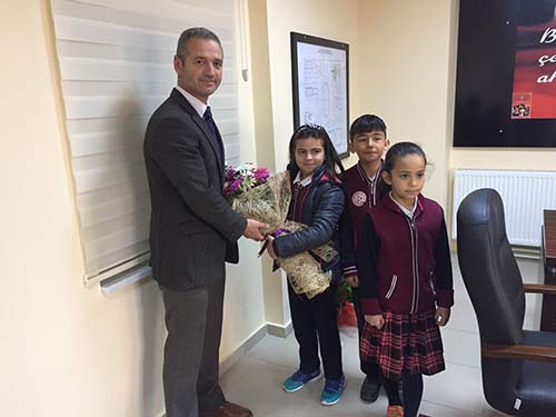 Yeni yüzyıl ilkokulu öğrencisi Belinay Kaya ve sınıf arkadaşları, Okul Müdürü Mehmet Kılıç ve müdür yard. Abdullah Çakır ile Hendek Gençlik Hizmetleri ve Spor ilçe Müdürü Süleyman Akıcı’yı ziyaret etti.