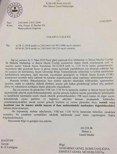 01 Ocak 2019 tarihinden seçim 31 Mart 2019 tarihine kadar muhtar adayların asmış olduğu pankart, döviz, afiş vb. reklamların asılmayacağı ve asılı olan pankart, döviz ve afişlerin kaldırılması, kaldırılmaması durumunda seçin kanuna muhalefetten gerekli işlem yapılacağı, belirtilen tarihler arasında cadde, işyerlerine, balkonlara, billboardlara, apartmanlara, araçlarına, aydınlatma direklerine, vb halkın görebileceği yerlere asılmasının yasak olduğu, Muhtar adayların sadece el ilanı dağıtabilecekleri YSK kararında belirtilmiştir.