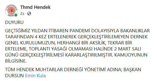 Tüm Hendek Muhtarlar Derneği Başkanı Emin Kula’nın Tüm Hendek Muhtarlar Derneği sosyal medya hesabından yaptığı paylaşımda, “Geçtiğimiz yıldan itibaren pandemi dolayısıyla Bakanlıklar tarafından 4 kez ertelenerek gerçekleştirilemeyen Dernek Genel Kurulumuzun, herhangi bir aksilik, tekrar bir erteleme, toplantı yasağı olmaması halinde 2 Mart Salı günü gerçekleştirilmesi kararlaştırılmıştır. Kamuoyunun bilgisine. Tüm hendek muhtarlar derneği yönetimi adına; Başkan Dursun Emin Kula” ifadelerine yer verildi.
