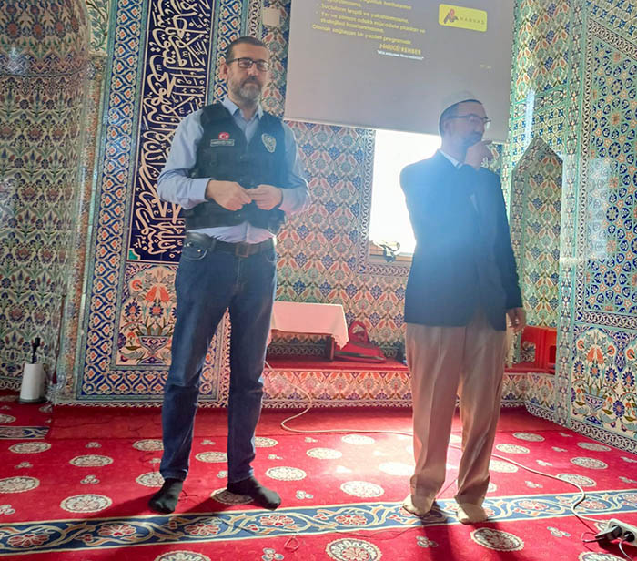 Hendek Çağlayan Mahallesi Camii’nde, Sakarya Narkotik Polis Memuru Komiser Ayhan bey tarafından zararlı maddelerden korunma yolları, güvenli yaşam için dikkat edilmesi gereken hususlar ve polis teşkilatının topluma sunduğu hizmetler hakkında detaylı bilgiler verdi.