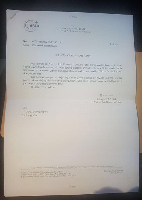 Hendek Kaymakamlığının Teknik İnceleme istediği AFAD Gözlemsel Etüd Raporu sonuçlandı, mühürler söküldü.